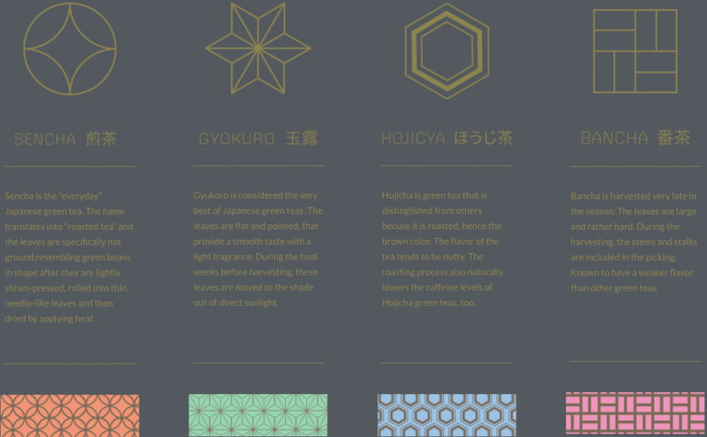 Assigning a symbol extracted from Japanese traditional patterns and specified color to each kind of tea helps users distinguish different types of teas instinctively and promotes the recognition of varieties of Japanese tea.